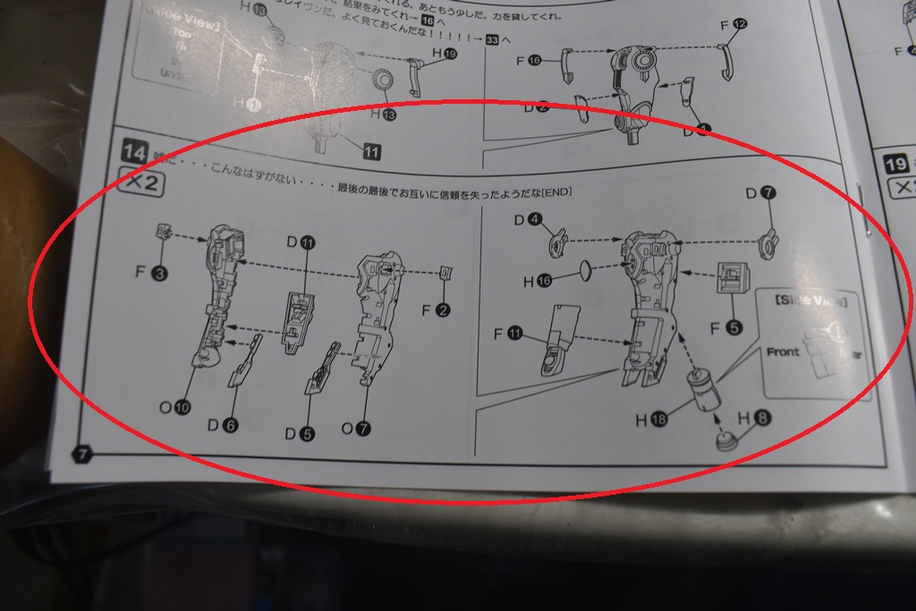 例えば「D」のランナーをもったら、丸の部分の「D」の4,5,6,7のパーツを全部切り取ってしまうというような感じです。