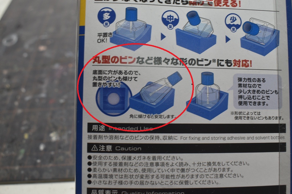 そういったとき、ビンを傾かせて使う方も多いと思いますが、このボトルスタンドなら、溝に入れることによって接着剤を斜めに設置させることができます。