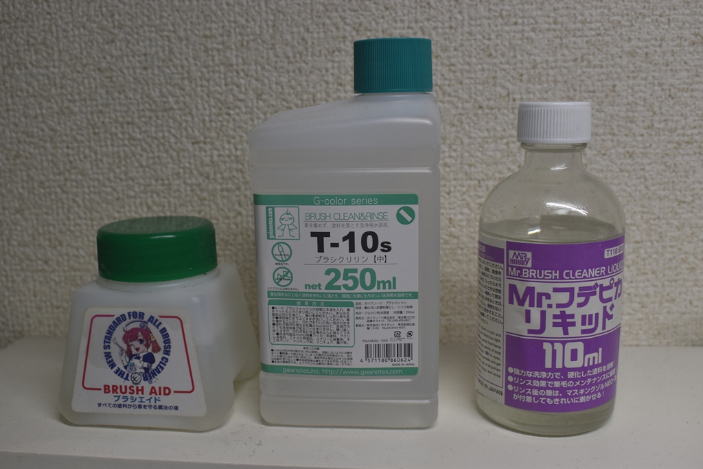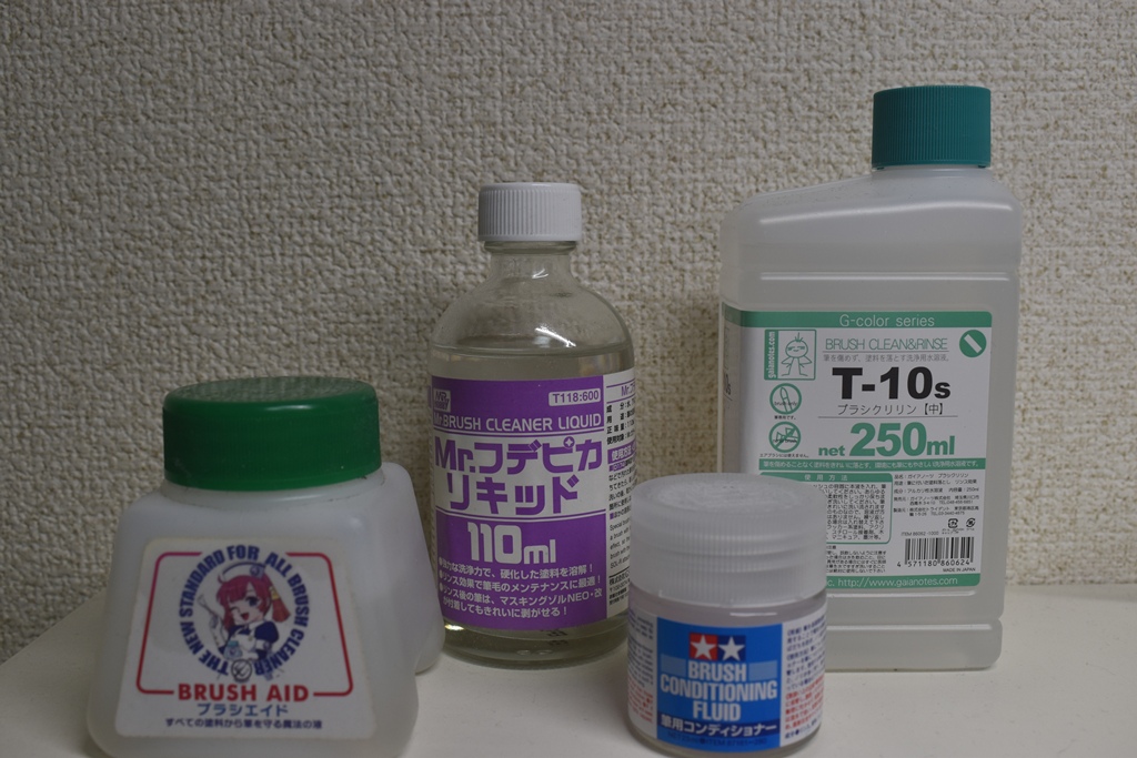 筆の洗浄液というのは、トライデントさんの「ブラシエイド」やガイアノーツさんの「ブラシクリリン」クレオスさんの「筆ピカリキッド」などがありますね。