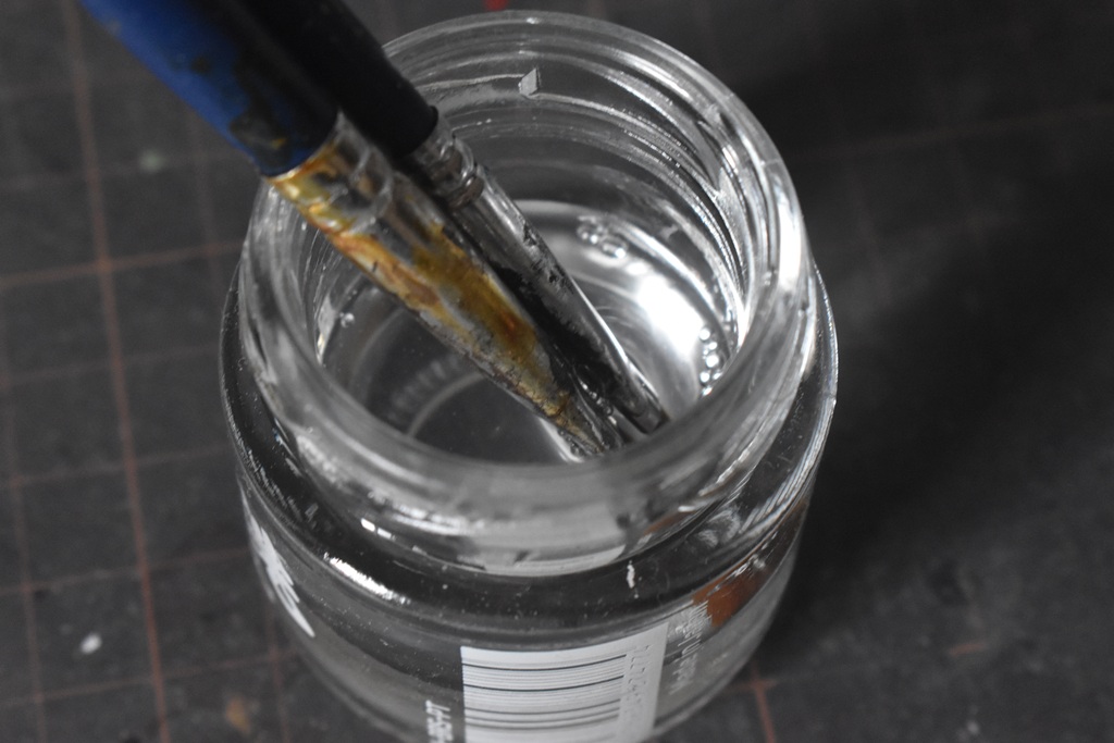 基本的に、制作中に別の色を塗ろうとしたときに筆を洗うものではなく、筆に付いて取れなくなった汚れを強力にクレンジングする、というのが役目です。