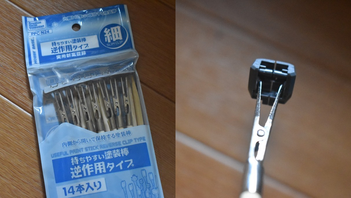 あれは『ペインティングクリップ』とか『塗装の持ち手棒』とか色々な呼ばれ方をしているのですが、実は100円ショップの材料で簡単に作ることが出来ます。